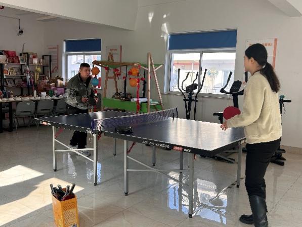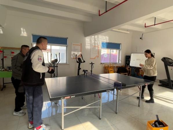 张书语和叶子宁两位同志则对接喜爱乒乓球的学员,在乒乓球室开展专项辅导。活动从充分的热身开始,特别关注手腕、脚踝等关节的保护。随后通过从原地垫球到行进间垫球的渐进练习,提升学员的控球能力与协调性。在对练环节,党员们重点指导正手攻球技术,鼓励学员在多回合互动中增强自信、体验乒乓运动的乐趣。